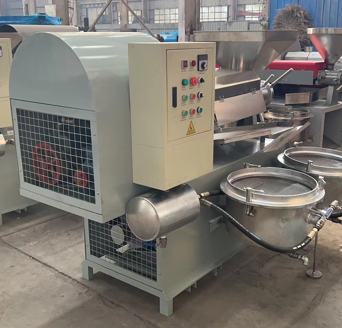7.新榨油機安裝后進行4—8小時磨榨,方法是用已榨干油的餅料從料斗中緩緩喂入,反復回榨,使榨膛磨光,切記開始磨榨不要將料直接倒入料斗內,而以手抓喂入為宜,以防榨螺軸卡死。如喂料過猛,榨膛內出現異常響聲或榨螺軸卡死,應立即停車,消除梗阻,或重新裝配好后再啟動磨榨,嚴禁強行拖車。8.正常榨油時,必須保持進料均勻,切勿過多過少或斷料空轉。此時機器負荷正常,運轉平穩,響聲有節奏。出餅順暢,低壓段基本無渣,高壓段有少量油渣,但渣在油中的比例不大于10%,榨膛內溫度可達150—200℃,出餅口出冒出青煙應通過護罩由抽煙管排出。榨出熱餅要及時攤開,不要急于打堆或裝運,否則會產生自然現象。當連續工作時間較長,機溫過高時,應采取電扇吹風等降溫措施。